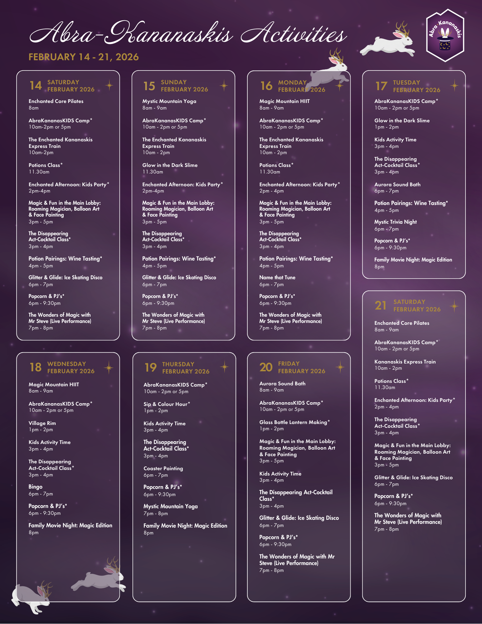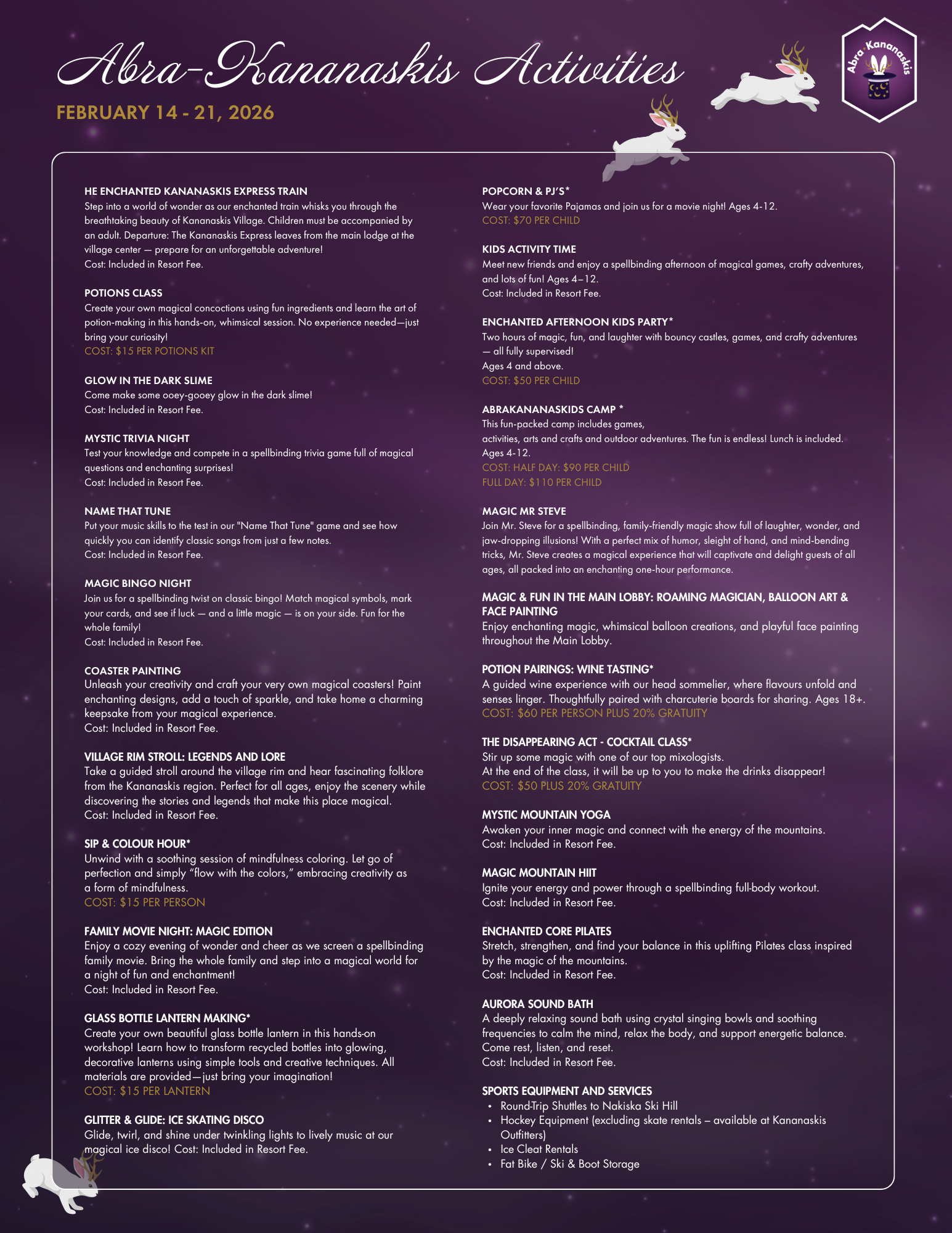 Terms and conditions: Activities are subject to change. Many experiences are included in the resort fee; some may require an additional charge. Please see the full Abra-Kananaskis schedule for details.